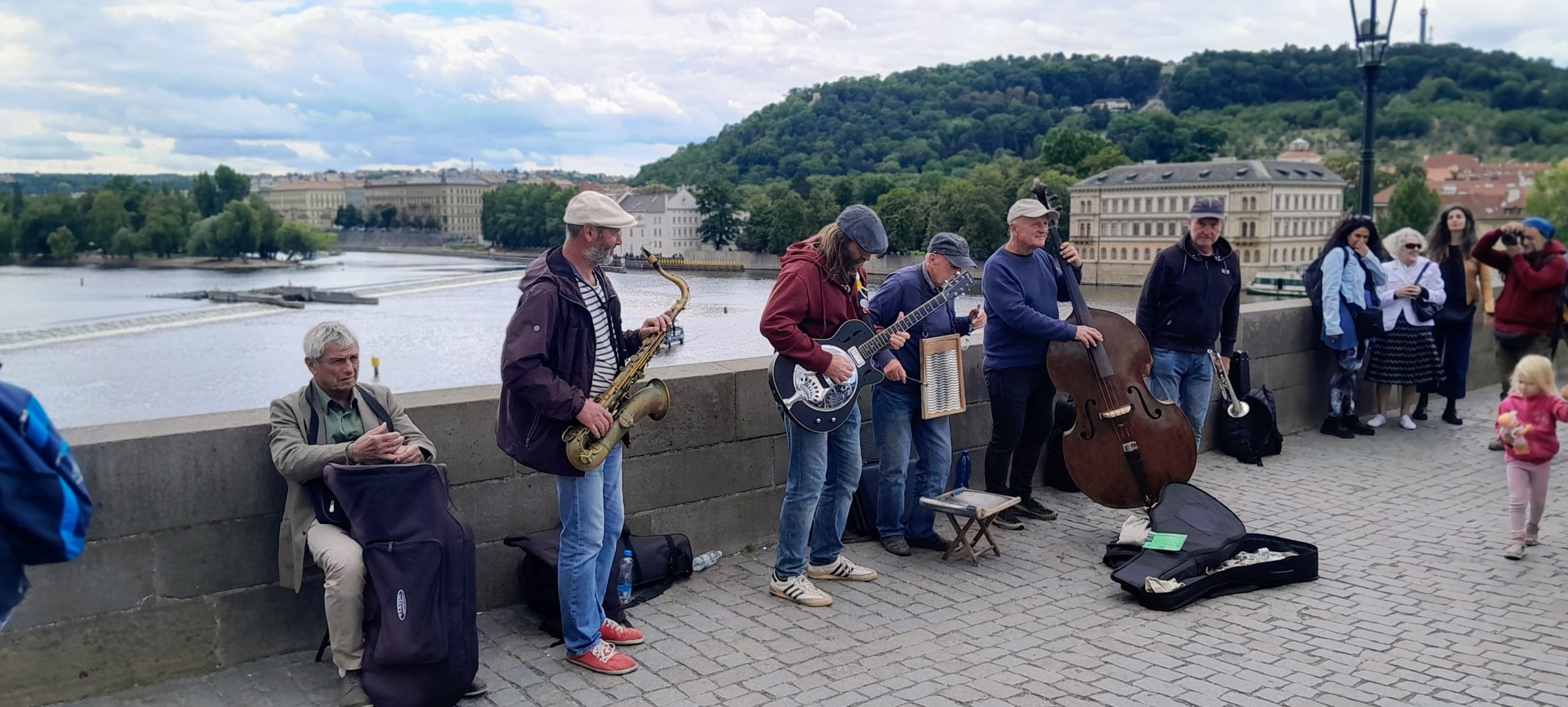 Decíamos que era imprescindible hacer dos recorridos por la emblemática figura que identifica a Praga. Por la mañana, y cuando se acerca el mediodía el ambiente se llena de música de los artistas callejeros, de colores, pinceles y acuarelas de los pintores y dibujantes callejeros y de gestos de admiración y sorpresa por cada detalle que cada uno va descubriendo a medida que se acerca a cada estatua o detalles de la obra. Es una suerte de sinfonía humana para agasajar a un lugar lleno de encanto.