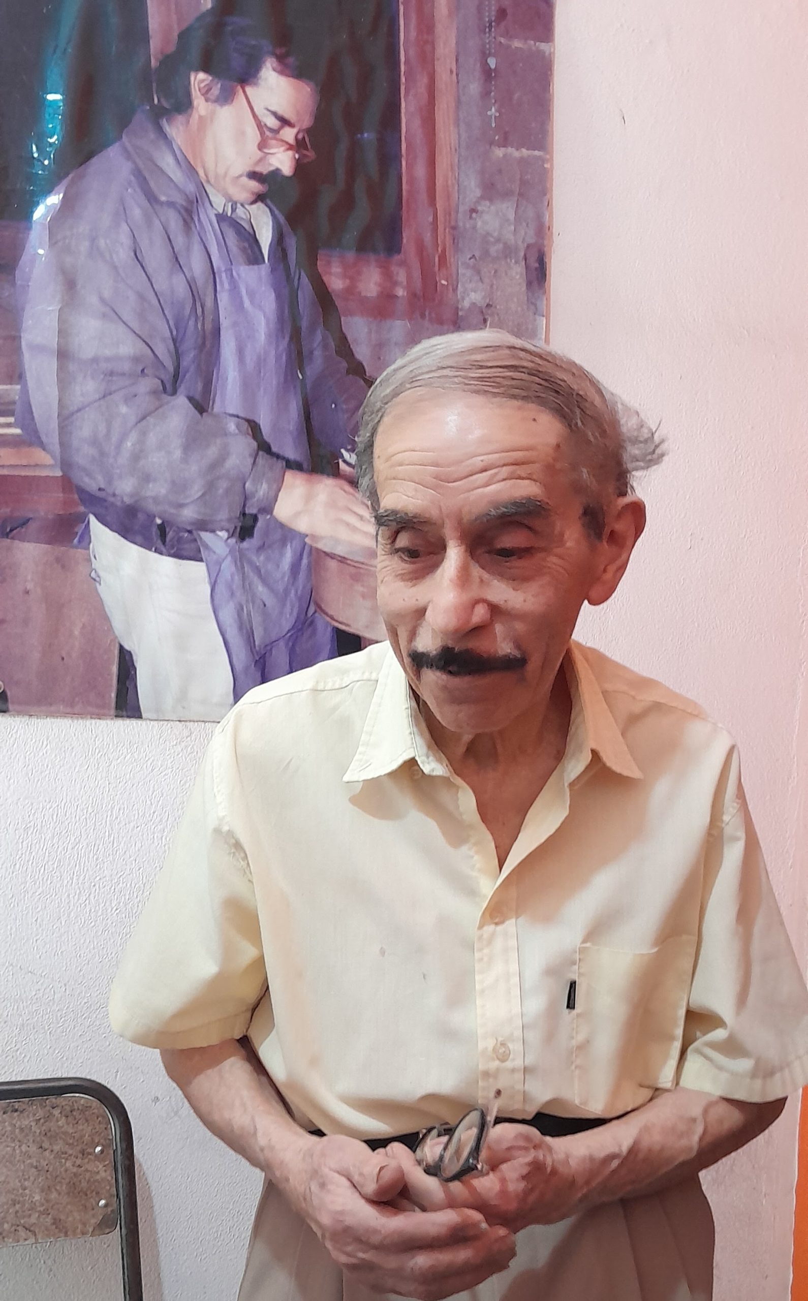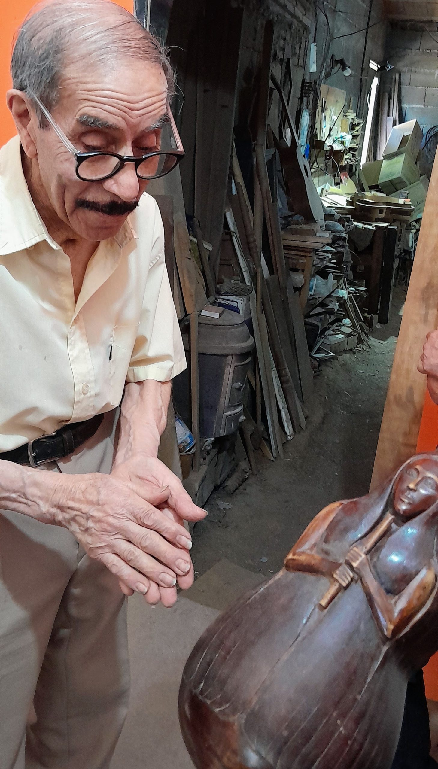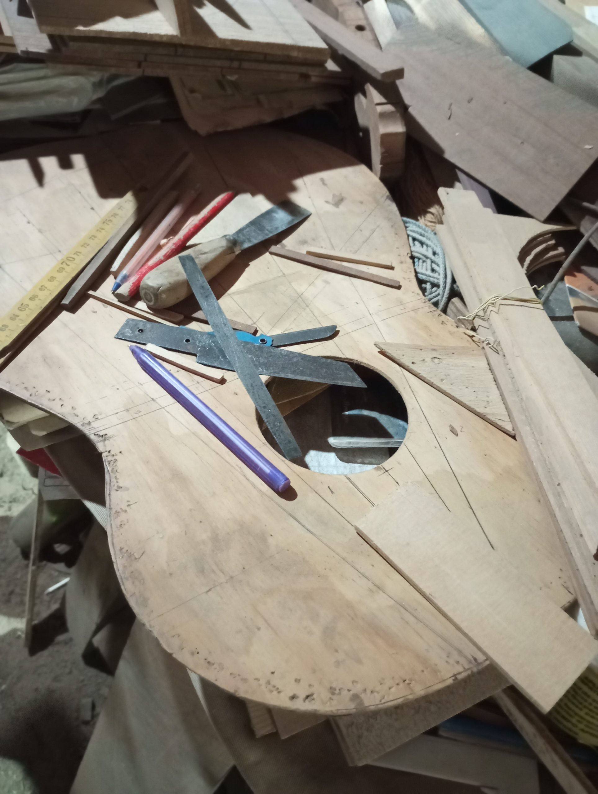 Nos recibe en su taller, conocido como “El Templo de la Guitarra”. Pide disculpas por el desorden de maderas, herramientas y cuerdas: materia prima en estado de proceso. Nada sobra. Nada está fuera de lugar. Es la antesala donde la madera se convierte en instrumento.
